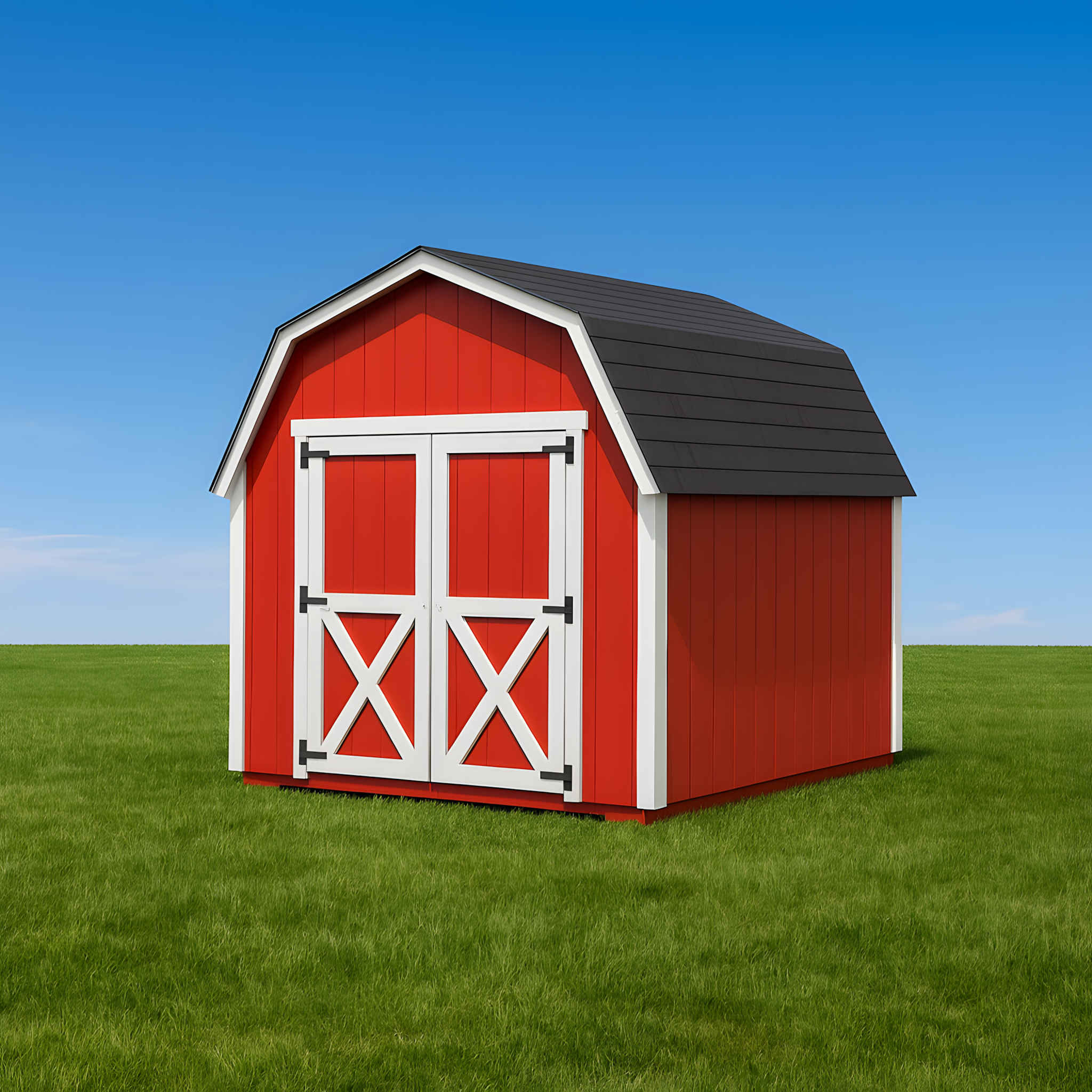 Rød trekonstruksjon med gavltak, mål 300x200x240 cm. Gir ute lagrings- eller arbeidsplass. Solid trestruktur, takform sikrer drenering. Brukes til oppbevaring av hageutstyr, verktøy eller som anneks.